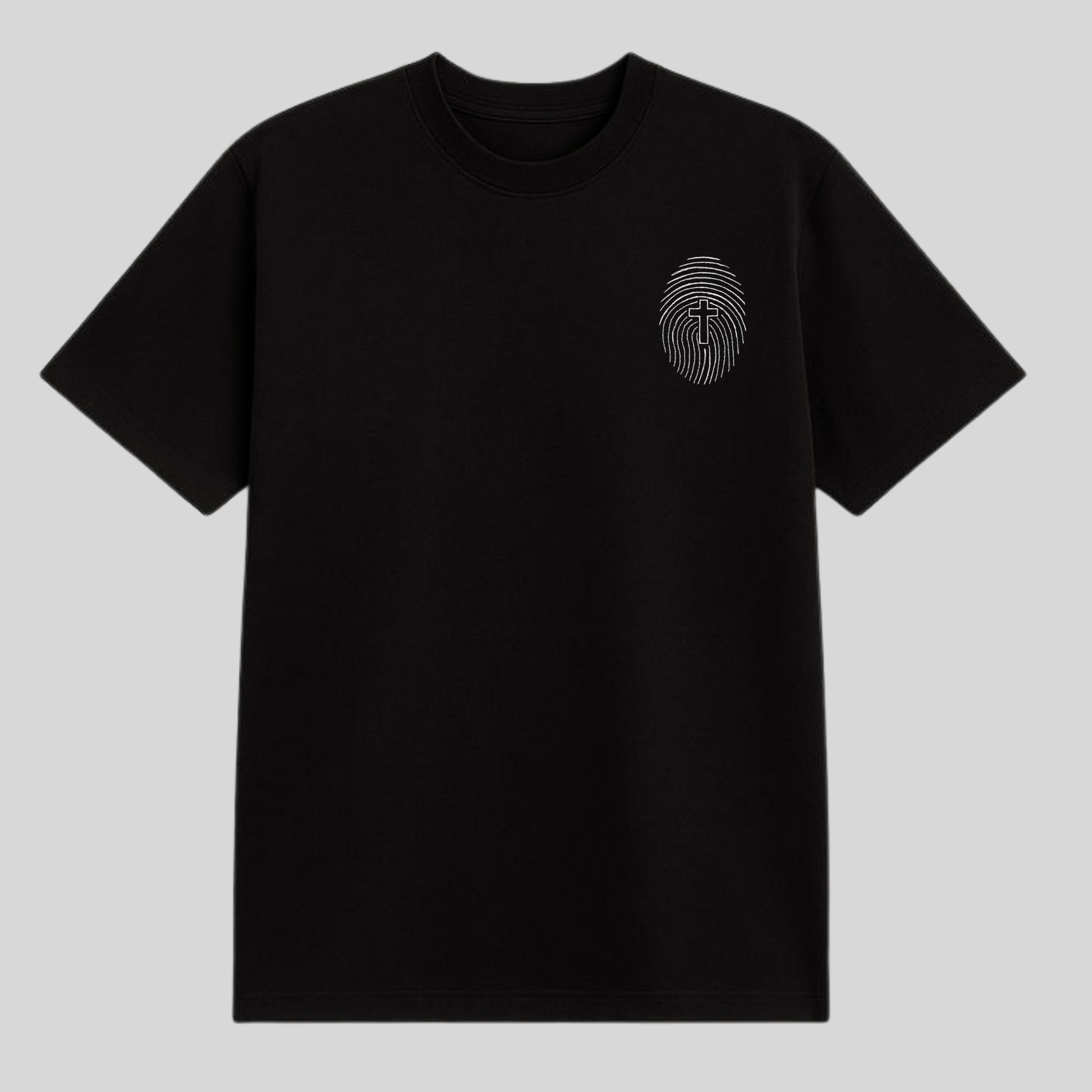 - Diseño frontal: Huella con cruz minimalista, símbolo de fe y propósito.